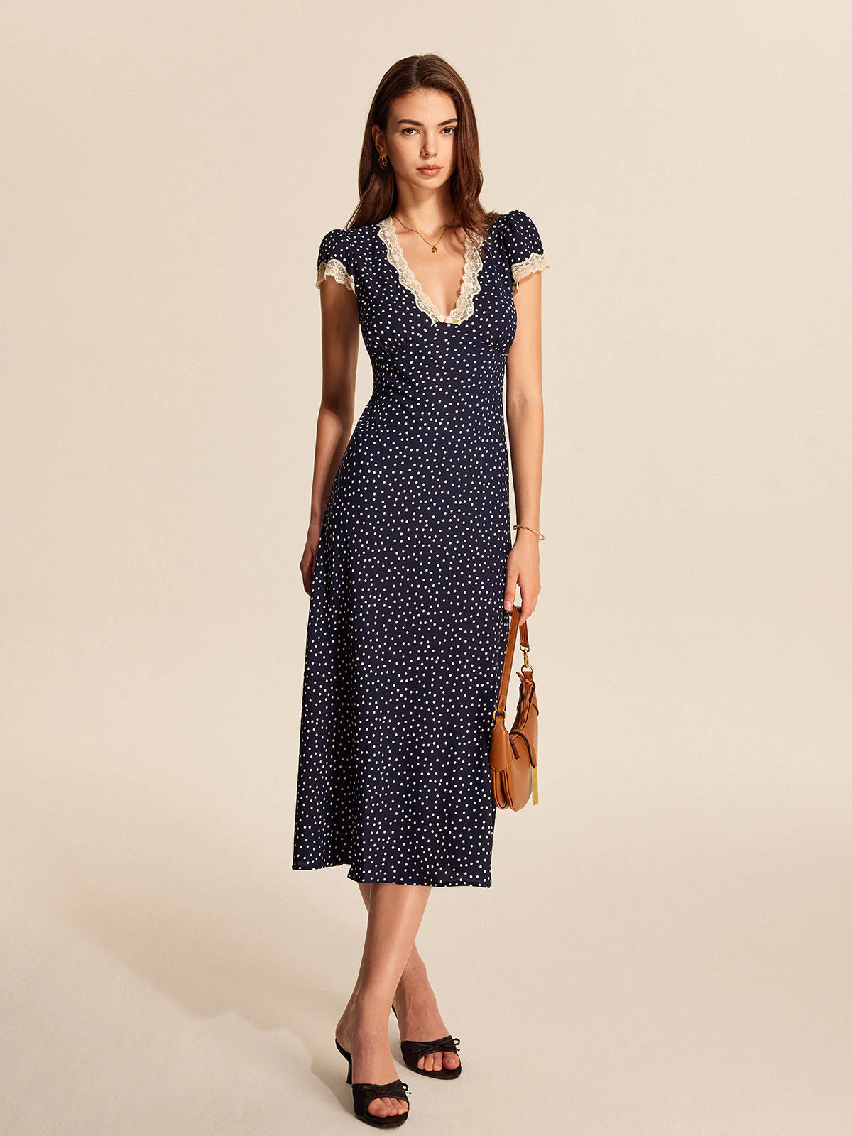 Şık Dantel Detaylı Çarpıcı Puantiyeli Elbise