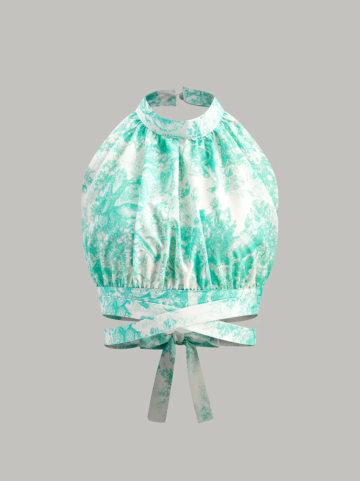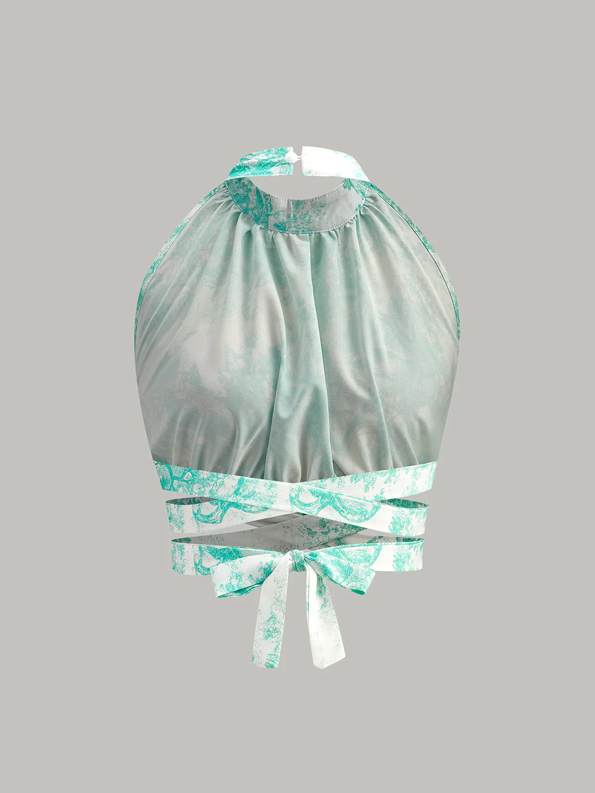 Çiçek Desenli Halter Yaka Bağcıklı Üst