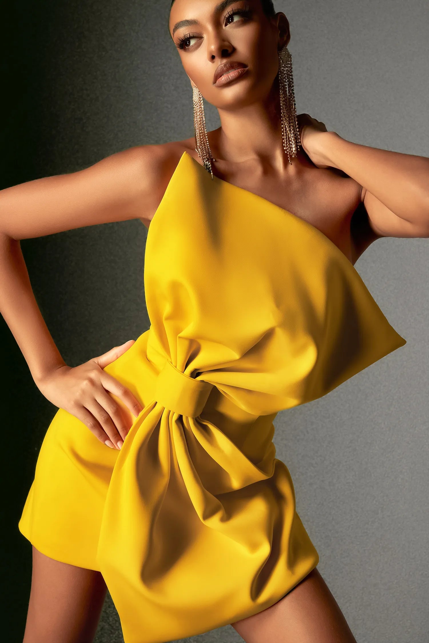 Majrela Fiyonklu Straplez Mini Elbise ile zarafeti yakalayın! Bu elbise, ön kısmındaki dikkat çekici fiyonk detayıyla hem eğlenceli hem de zarif bir tasarım sunar. Esnek olmayan dokuma kumaştan üretilmiştir ve bu sayede yapılı bir silüet oluşturur. Canlı sarı rengi ise elbiseye büyüleyici bir dokunuş katar. Şık sarkıt küpeler ve uyumlu topuklu ayakkabılarla kombinleyerek dengeli ve zarif bir görünüm elde edebilirsiniz.